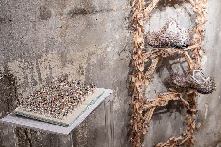 Ink, acetate, pins, resin, rubber, repurposed book, Against The Loveless World by Susan Abdulhawa